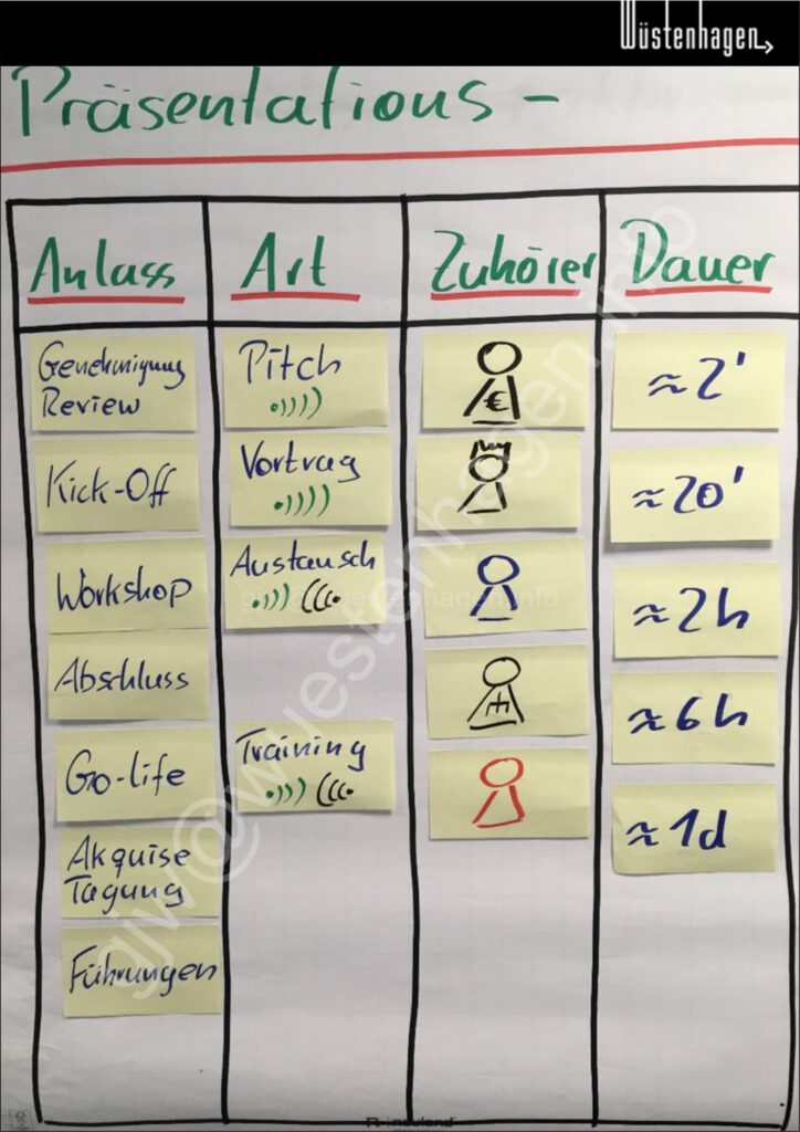 Die Bedeutung und die beabsichtigte Wirkung von Ergebnissen lassen sich in den wenigen Sekunden einer sogenannten Fahrstuhlrede bis hin zu mehrtägigen Trainings vermittelt. Sehr häufig sind Präsentationen zwischen 15 und 30 Minuten.