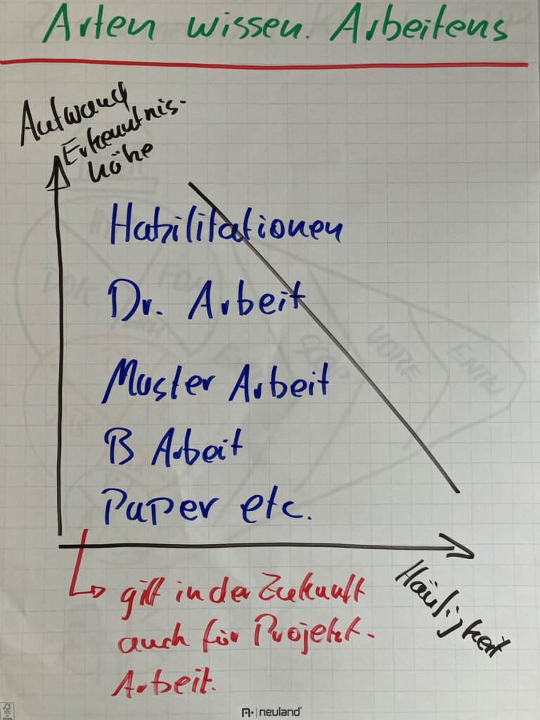 Die unterschiedlichen Arten bauen aufeinander auf. Dem Aufbau folgend nimmt die Häufigkeit ab. Parallel nimmt der Aufwand zu. Dieser Aufwand spiegelt zwei Aspekte wider: Der Grad der Eigenständigkeit und der Grad der Erkenntnishöhe. Ein Kandidat für eine Bachelor-Arbeit wird durch Prüfer und Betreuer intensiver begleitet werden als ein Kandidat einer Promotions-Arbeit (vgl. Bänsch & Alewell, 2013). Außerdem erwartet die Wissenschaftswelt von einer Promotion eine bedeutendere Erkenntnis als von einer Bachelor-Arbeit (vgl. Theisen, 2017).
