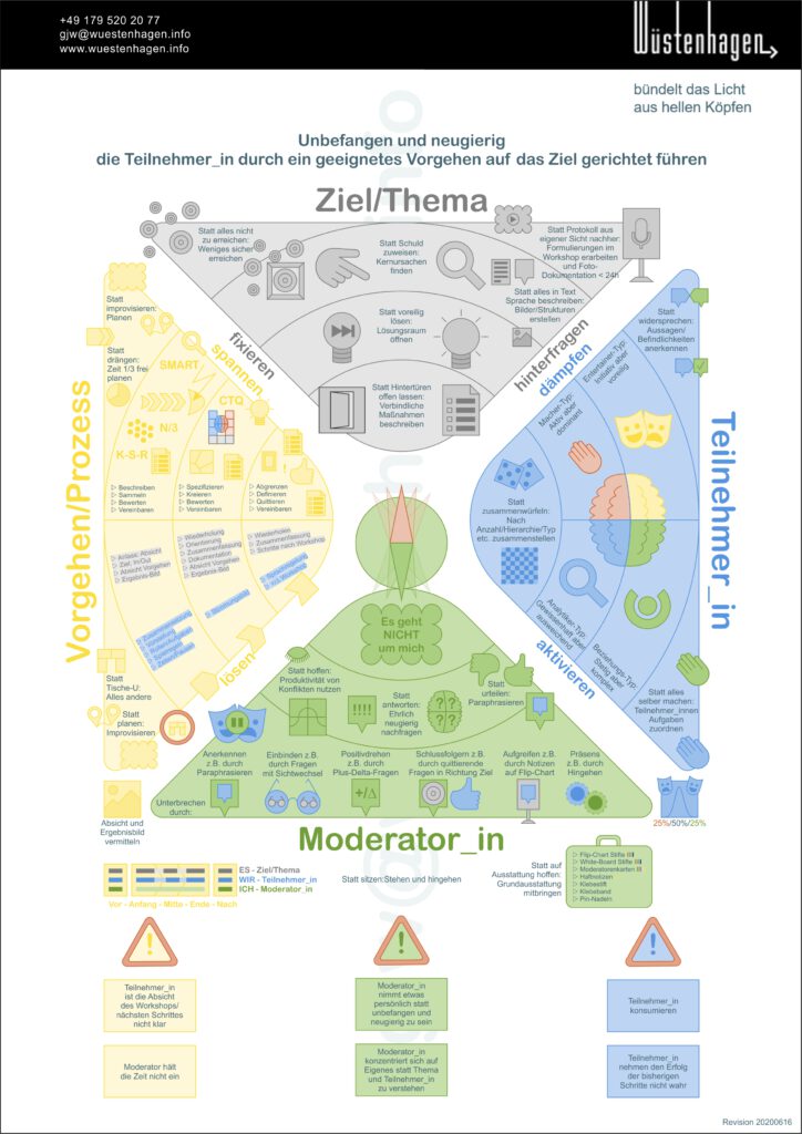 The compass needle in the head is intended to symbolize that the procedure requires the participant to be continuously aligned with the goal. The risk of personal involvement is highlighted and supplemented by a detailed level. Aspects of constructive interruption of the participant are listed.