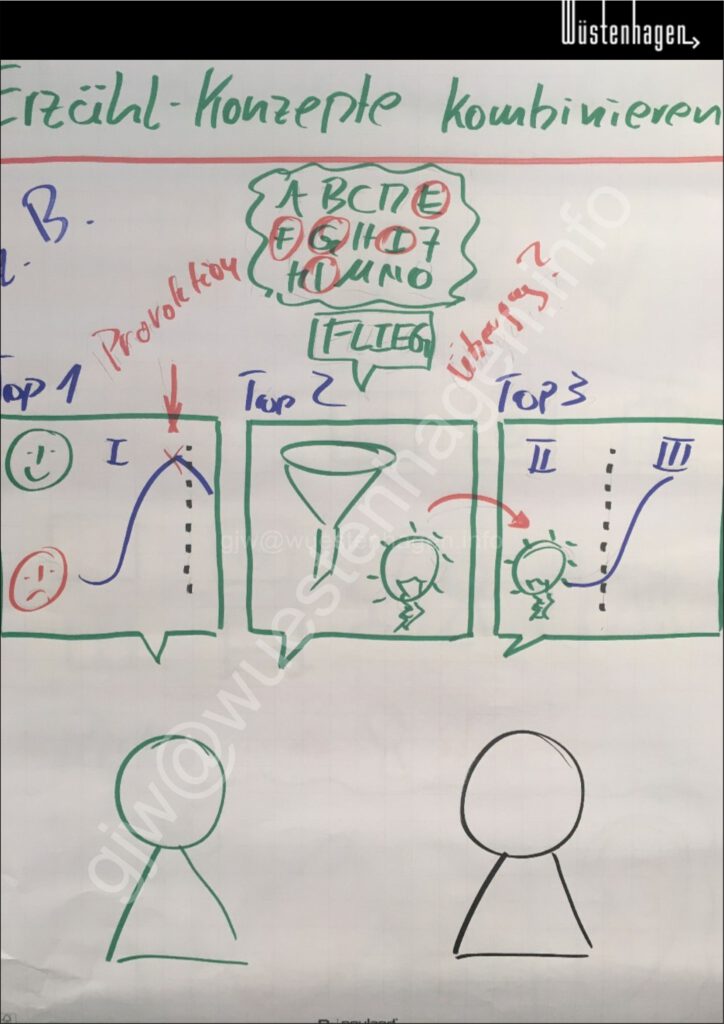 Bei der Wahl und Kombination der Erzählkonzepte sollte auch berücksichtigt werden, dass der Zuhörer sich oft nur den Anfang und das Ende eines Abschnittes merken kann. Die Mitte geht oft verloren. Oft konzentrieren sich Fachleute auf die Gestaltung der Mitte.