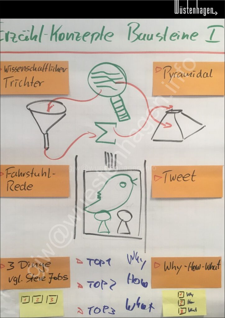 Die Mischung der drei Zugänge bilden sich in Erzählkonzepten ab. Diese spiegeln typische Abfolgen oder Strukturen bei Präsentationen wieder.