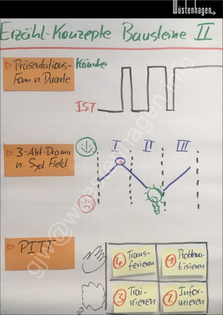 • The 3-act drama according to Syd Field, as seen in many modern cinema films, also appeals to the emotional side of listeners and is still rare in the workplace. Through an exemplary narrative about people, listeners are emotionally engaged. The protagonist experiences the ups and downs of a situation familiar to the listeners. The listener clearly recognizes its transferability.