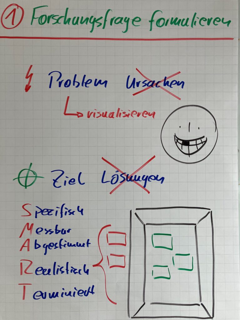 Zu Beginn wird das zugrundeliegende Problem beschrieben – idealerweise flankiert durch eine Visualisierung. Die Problemformulierung sollte ohne Ursachenvermutung, die Zielformulierung ohne Lösungsvermutung erfolgen. Dies beugt Lösungskurzschlüssen vor. Voreingenommenheit kann den Suchbereich einschränken und so für bedeutende Ursachen und Lösungen blind machen (vgl. Kerzner, 2017). Problem und Ziel sollten spezifisch, messbar, mit dem Prüfer abgestimmt, für die Art der Arbeit realistisch und entsprechend terminiert sein. Als Gedankenstütze hilft das Akronym SMART (vgl. Doran, 1981).