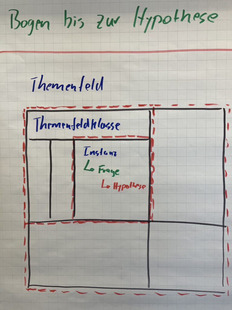 Eine alternative Herangehensweise ist, den Bogen bereits vom Problem bis zur Hypothese zu spannen und im Laufe der ersten vier Schritte zu überarbeiten. Dieses Überarbeiten wird nicht ausbleiben, da erst mit der Recherche alle relevanten Erkenntnisse für eine qualifizierte Hypothese vorliegen (vgl. Creswell 2014).
