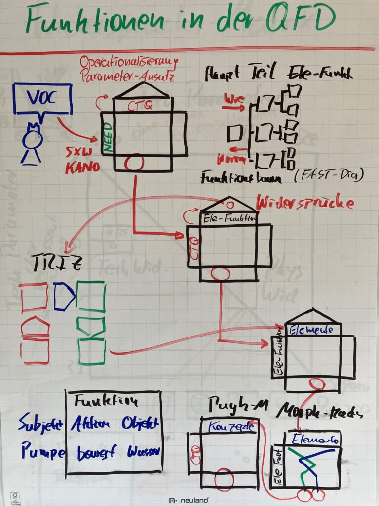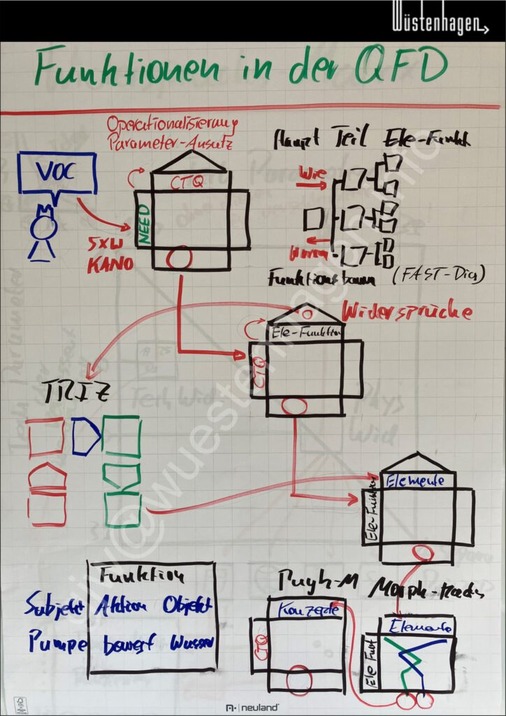Für das Anwenden von TRIZ ist ein tiefes Funktionsverständnis des Problems hilfreich. Daher sei hier die Abfolge der Häuser der Qualität (#1-#3) der QFD (Quality-Function-Deployment – Qualitätsfunktionendarstellung) dargestellt. Außerdem sind Werkzeuge verknüpft, die beim Zeilen-Spalten-Übergang innerhalb der Häuser helfen. Dreh- und Angelpunkt hier ist das Haus #2, in dem die CTQ mit den Elementar-Funktionen verknüpft werden. Zum Ermitteln der Elementar-Funktionen hilft ein Funktionsbaum oder FAST-Diagramm. In den Häuser werden im Dach jeweils mögliche Widersprüche der Spalteninhalte ermittelt. Im Haus #2 also die Widersprüche der Elementar-Funktionen. Solche Widersprüche lassen sich mit TRIZ bearbeiten. TRIZ liefert Ideen für Design-Elemente zum Realisieren der Elementar-Funktionen.