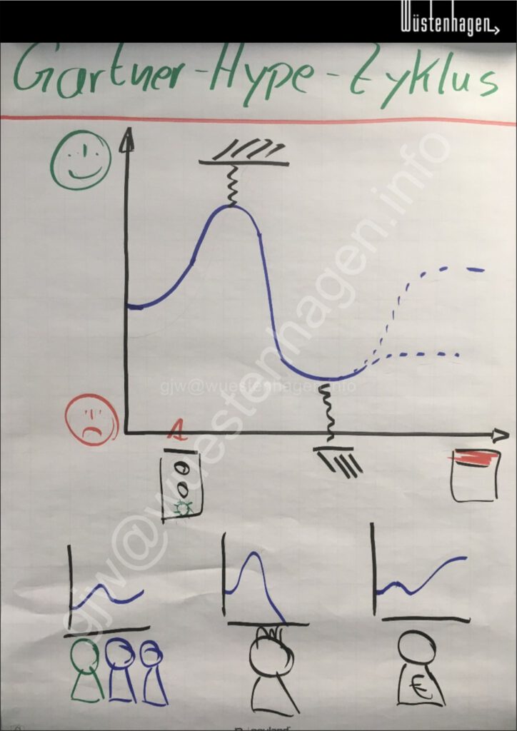 Im >Definieren< des Risikos des Gartner-Hype-Zyklus bewusst sein und durch Kommunikation und Arbeitspaketterminierung gestalten.