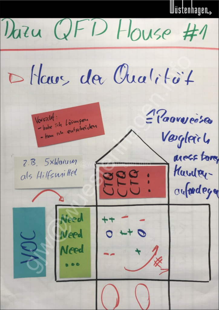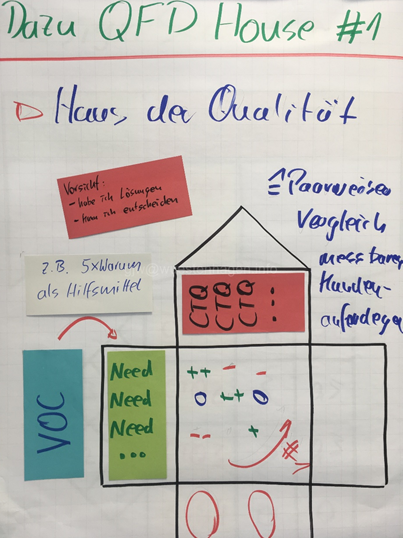 Anschließend stellt das Haus der Qualität #1 aus der QFD (Quality-Function-Deployment – Qualitätsfunktionendarstellung) die stärke des Zusammenhangs zwischen den CTQs und den NEEDs gegenüber. In der QFD liegt diese Matrix im Kern des Haus der Qualität #1. Das Ergebnis der Gegenüberstellung sind die CTQ, die maßgeblich notwendig sind, um die Bedürfnisse zu decken.