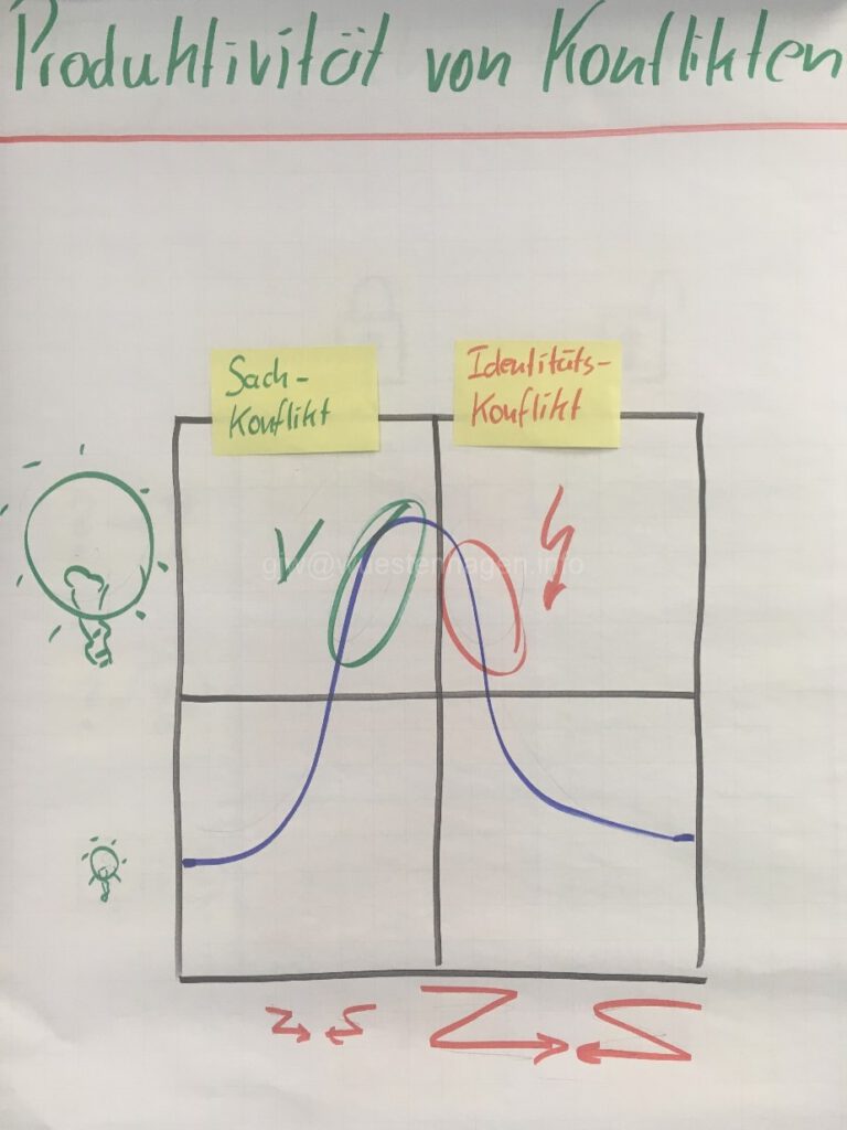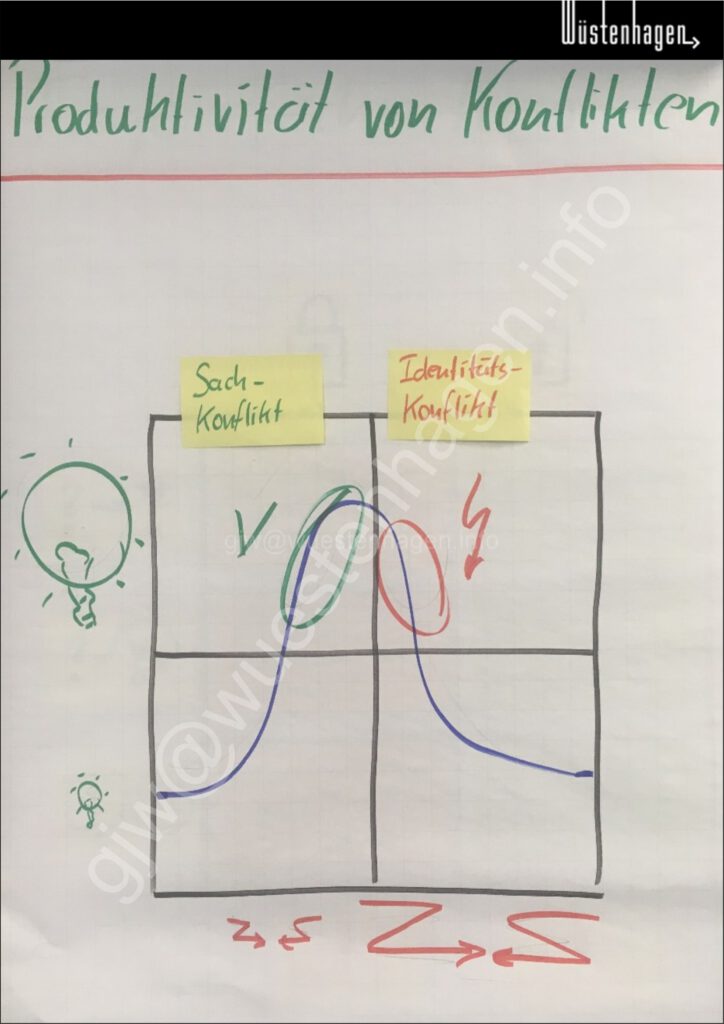 To determine the exact situation, very analytical conversations are often necessary. These may be perceived as „probing“ and can lead to tensions. Again, a matrix (by Redlich) can be helpful: It illustrates the intensity of conflict vs. productivity (problem-solving ability).
