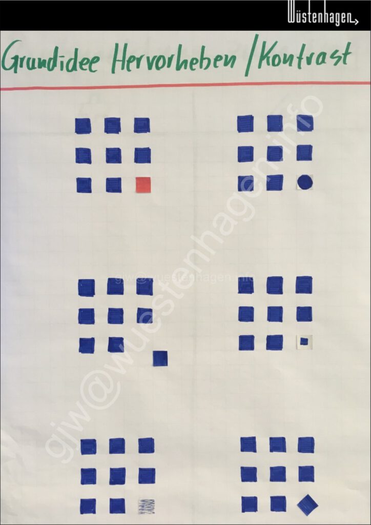 Die Grafik zeigt die sechs gängigen Möglichkeiten, Kontrast zu erzeugen und damit Dinge hervorzuheben: