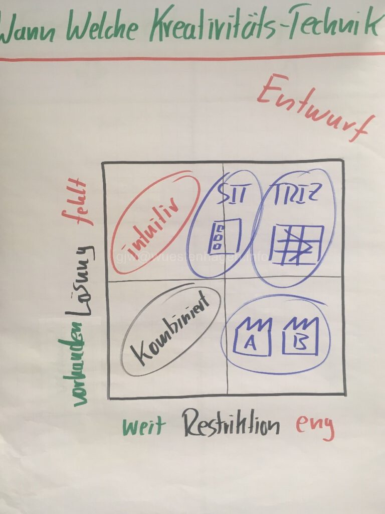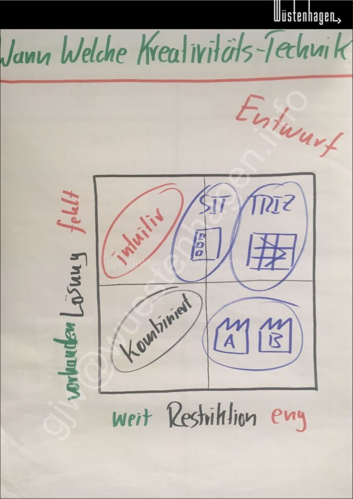 Eine Hilfe zur Auswahl eines geeigneten Werkzeugs soll diese im Entwurf (wieder im Interesse der Zugänglichkeit stark vereinfacht) dargestellte Matrix sein. Auf der einen Achse (hier die vertikale) ist aufgetragen, in wie weit bereits gleiche oder ähnliche Lösungen vorhanden sind. Auf der zweiten Achse (hier die horizontale) ist aufgetragen, in wie weit Ideen durch Sachzwänge, Richtlinien, Vorgaben oder Wiedersprüche (Restriktionen) ausgeschlossen werden.