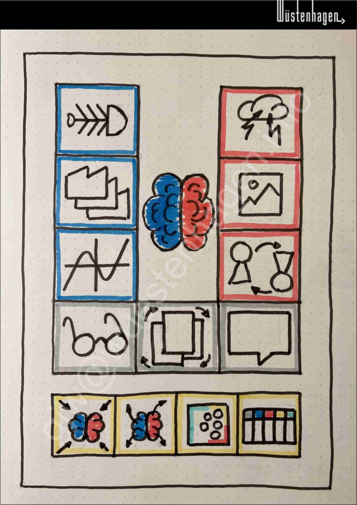 systematische Techniken, die mehr auf die linke Gehirnhälfte (die rationale) eingehen (vgl. Michalko, 2006). Intuitive Techniken, die mehr auf die rechte (die emotionale) eingehen (vgl. Buzan, 2010). kombinierende Techniken, die beide Gruppen nutzen (vgl. Altshuller, 1999).
