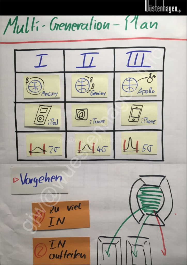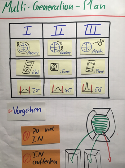 Der In/Out-Projekt-Rahmen kann erweitert werden in Richtung eines Multi-Generations-Plans. Insbesondere hilft der Multi-Generationen-Plan dabei, unrealistisch umfangreiche Projekte ein- und abzugrenzen. Dabei bleiben jedoch die weiterführenden Forderungen in einer Art Themenspeicher für Folge-Projekte erhalten.