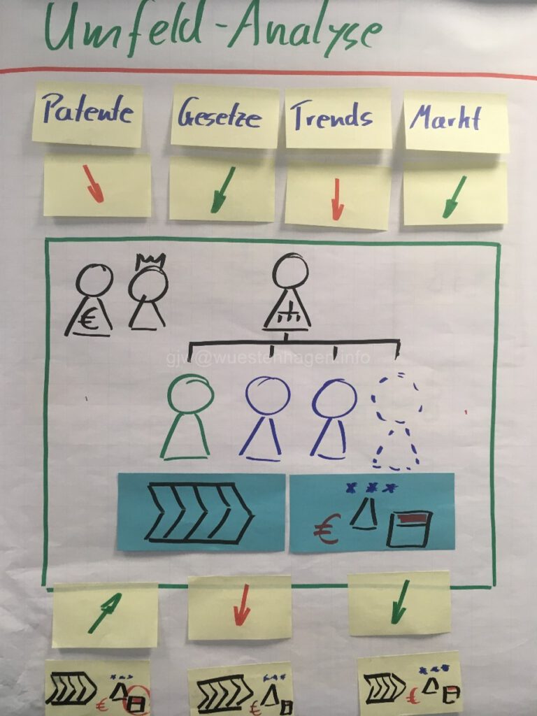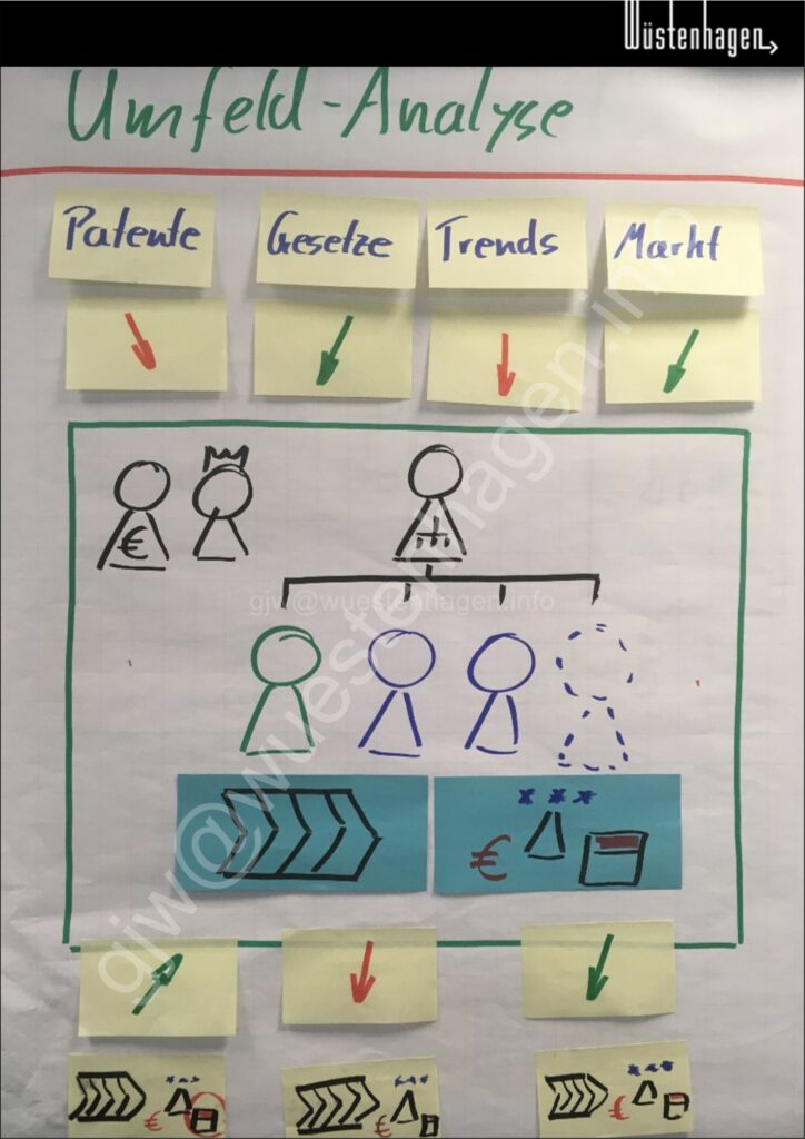Bei der Umfeld-Analyse beobachtet das Projekt-Team Aspekte, die auf das Projekt einwirken, obwohl diese nicht direkter Bestandteil des In/Out-Projekt-Rahmen sind. Diese Aspekte können außerhalb des Einflussbereiches der Organisation liegen (Patente, Gesetzte, Trends etc.) oder innerhalb des Einflussbereiches der Organisation (andere Projekte wie Verlagerungen, Softwareeinführungen, Technologiewechsel etc.).