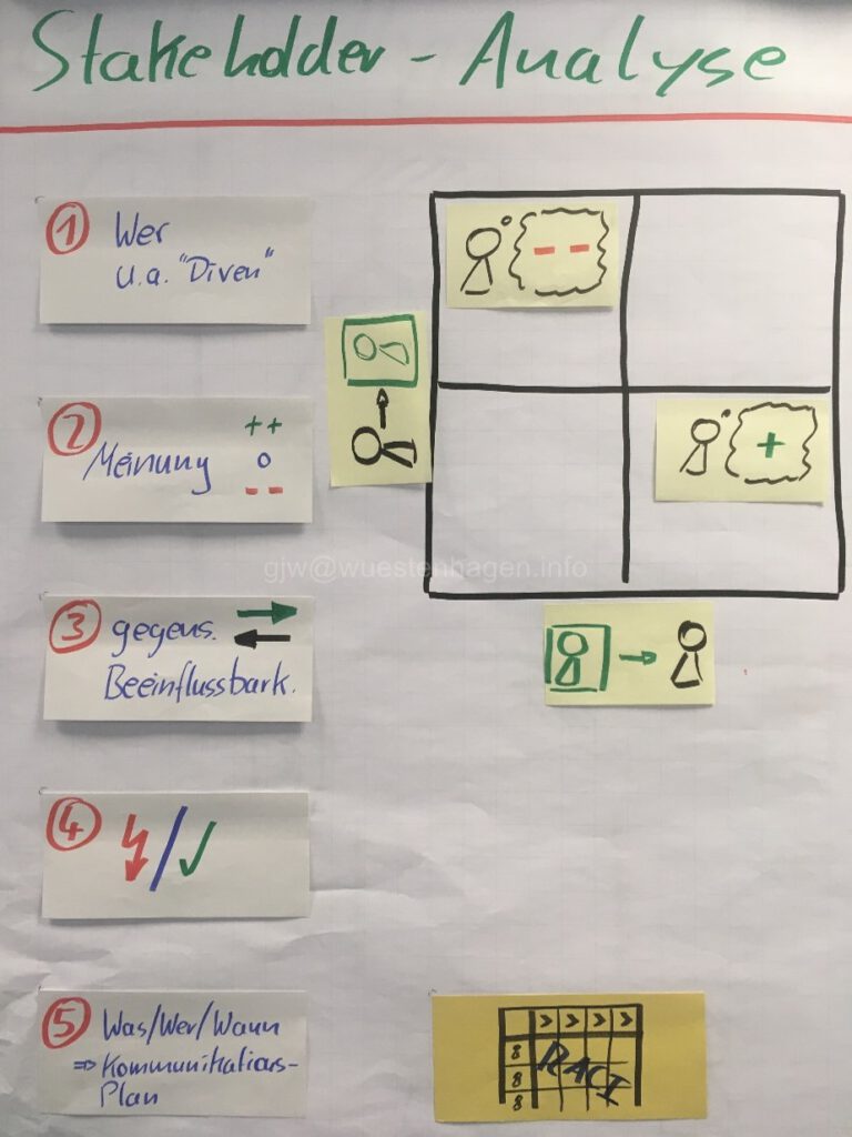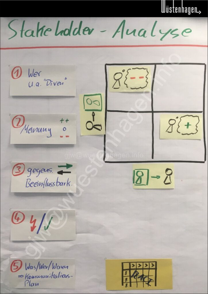 Bei der Stakeholder-Analyse ermittelt das Projekt-Team die Personen, die Einfluss auf den Projekt-Verlauf nehmen können. Das Ergebnis ist ein Kommunikations-Plan zum Beispiel in Form einer RACI-Matrix (Responsible-durchführungsverantwortlich; Accountable-kostenverantwortlich; Consulted-beratungsunterstützend; Informed-informationsberechtigt).