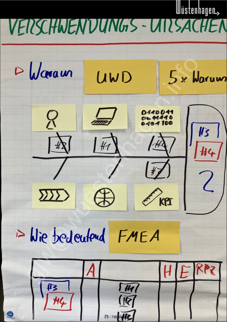 Werkzeuge, wie UWD, 5xWarum und eine Muri/Mura-Brille können z.B. zu den Kernursachen von Verschwendung führen.