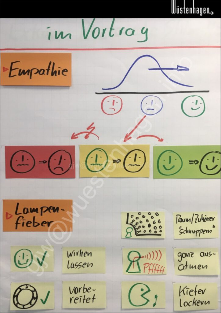 Stage fright is part of a good presentation in moderation – because it increases attention. Good preparation should serve as a calming background. At large events, it helps to take a look at the audience beforehand so as not to be surprised. Initial personal contact, which can be used in the presentation, also contributes to relaxation. Depending on your preferences, exercises to loosen the jaw or even power posing can also help.